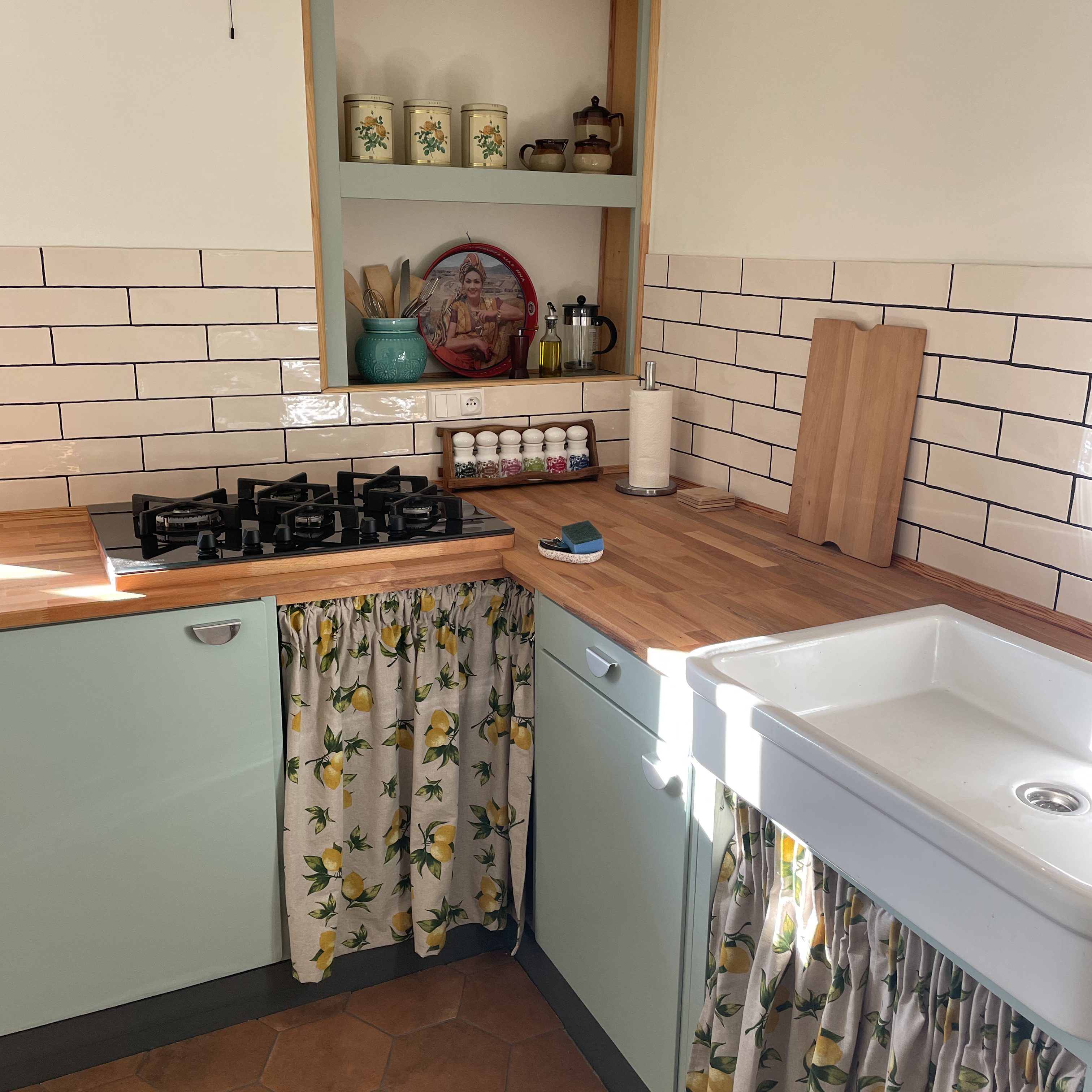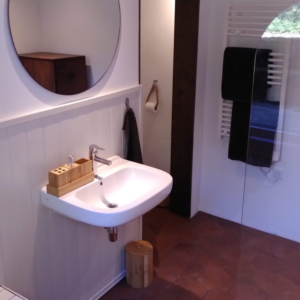 Via de woonkamer kom je in de keuken. Deze is geheel in landelijke stijl ingericht en van alle gemakken voorzien. Voor de keukenprins(ess)en die tijdens vakantie zelf willen koken, is er een luxe kookplaat met wokbrander en een kleine oven. En omdat maar weinig mensen afwassen leuk vinden, is er een vaatwasser. Vanuit de keuken bereik je de ruime badkamer, die tevens in landelijke stijl is ingericht. De badkamer is uitgerust met een ligbad waar je ook in kunt douchen (lage instap).